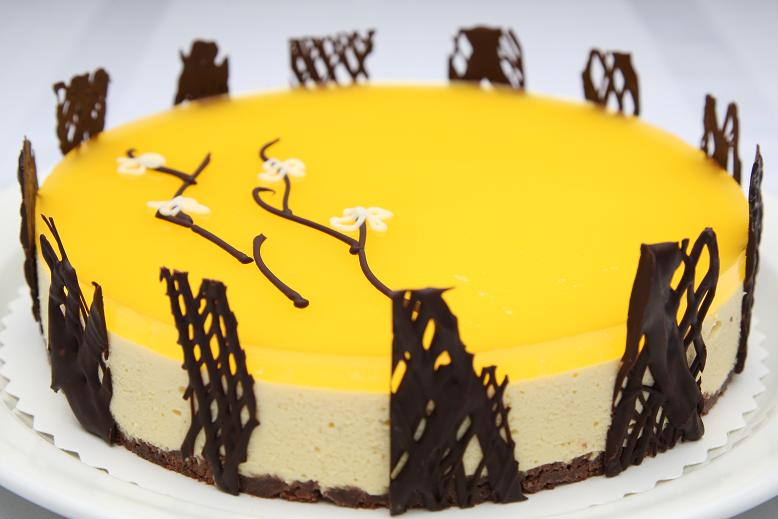Tummalla keksipohjalla samettinen mangovaahto sekä raikas appelsiinikansi.